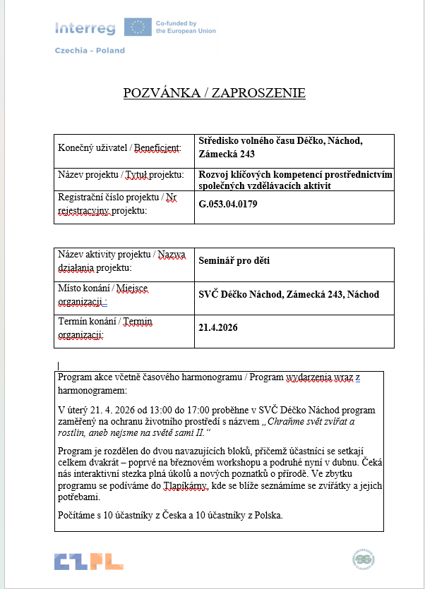 V úterý 21. 4. 2026 od 13:00 do 17:00 proběhne v SVČ Déčko Náchod program zaměřený na ochranu životního prostředí s názvem „Chraňme svět zvířat a rostlin, aneb nejsme na světě sami II.“
